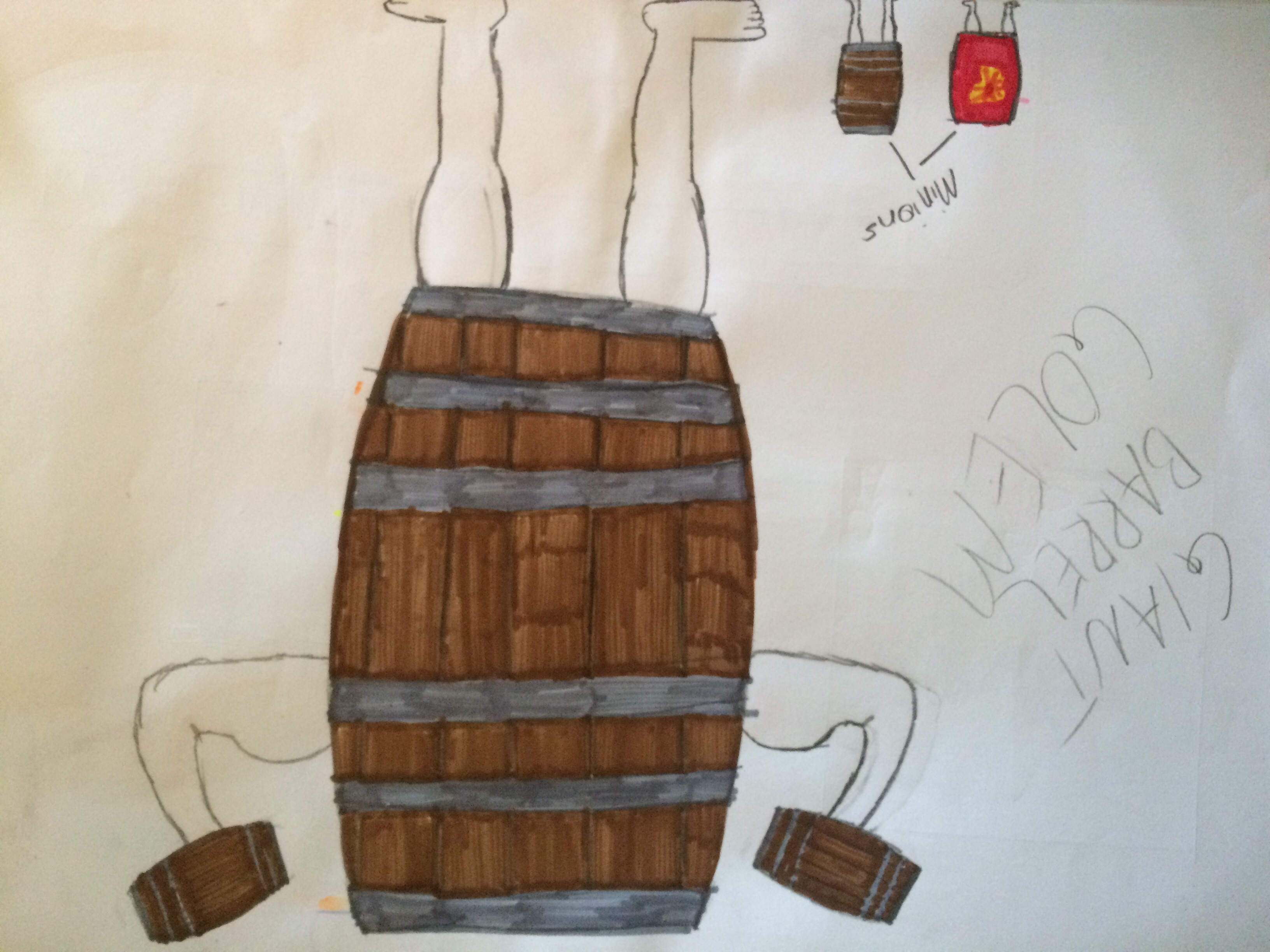 A giant barrel with beefy arms and legs with barrels instead of hands so he can pound the ground (photo down below)